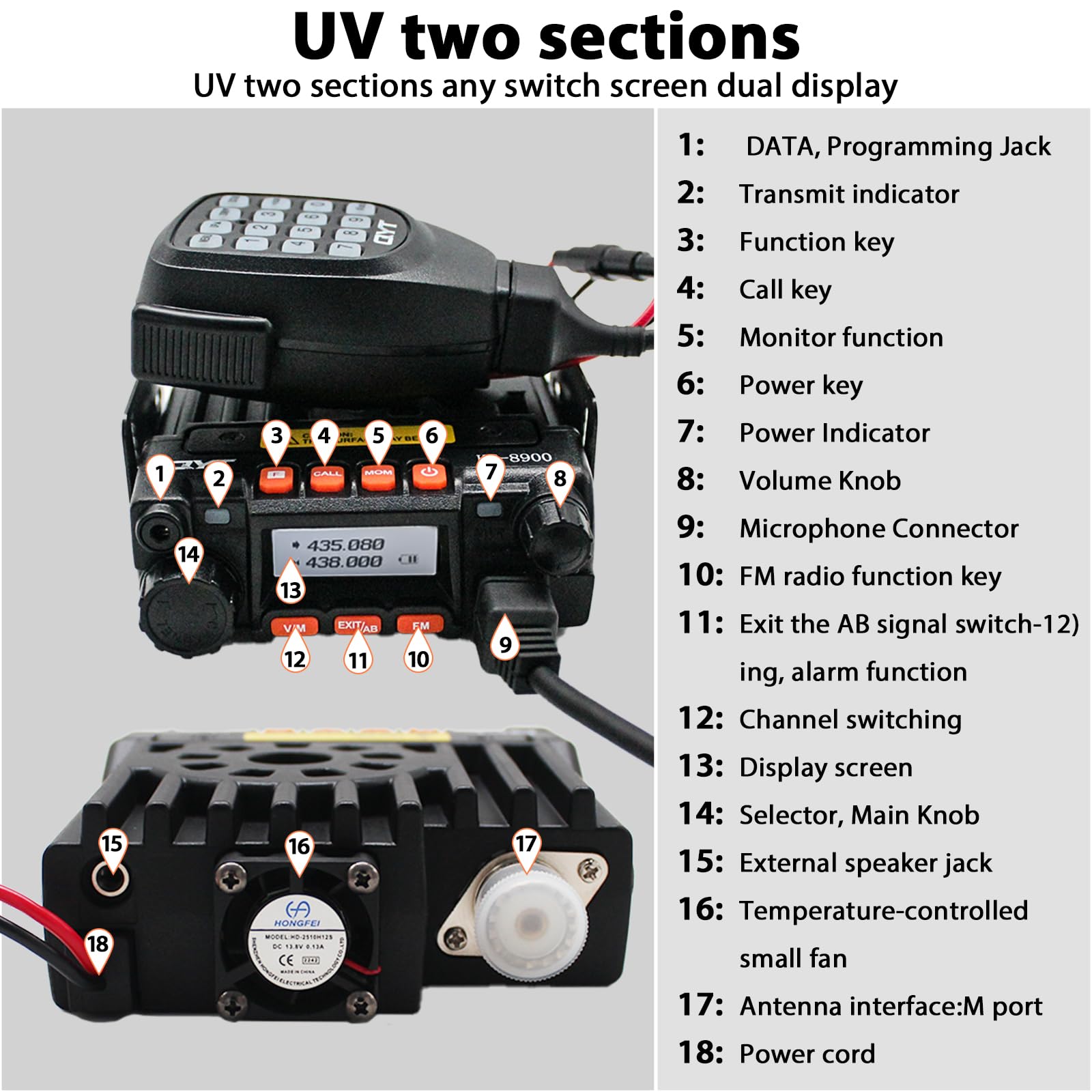 UV Dual Band Car Radio With Carplay, Dual Band 20W Car Radio Mini Car Radio Dual Band 136-174/400-480MHz Dual Guard Car Radio 13.8V Cigarette Lighter Radio (KT8900) Experience high quality, long range communication and superior band performance with the Dual Band UV Dual Band Car Radio 136-174/400-480MHz 13.8V. With advanced dual band technology and 20 watts of power, you can easily tune to two different frequencies and transmit simultaneously. Enjoy clear, reliable communications in any situation, from your daily commute to your next road trip.